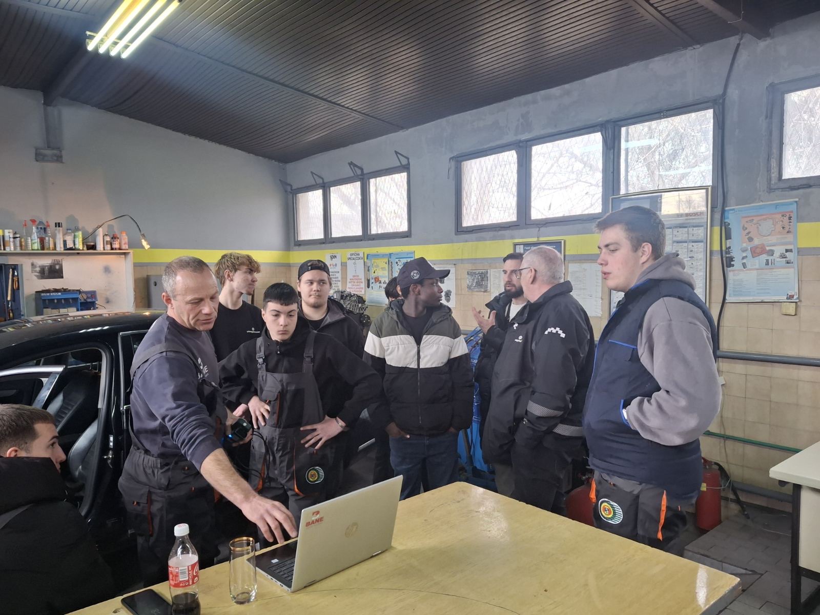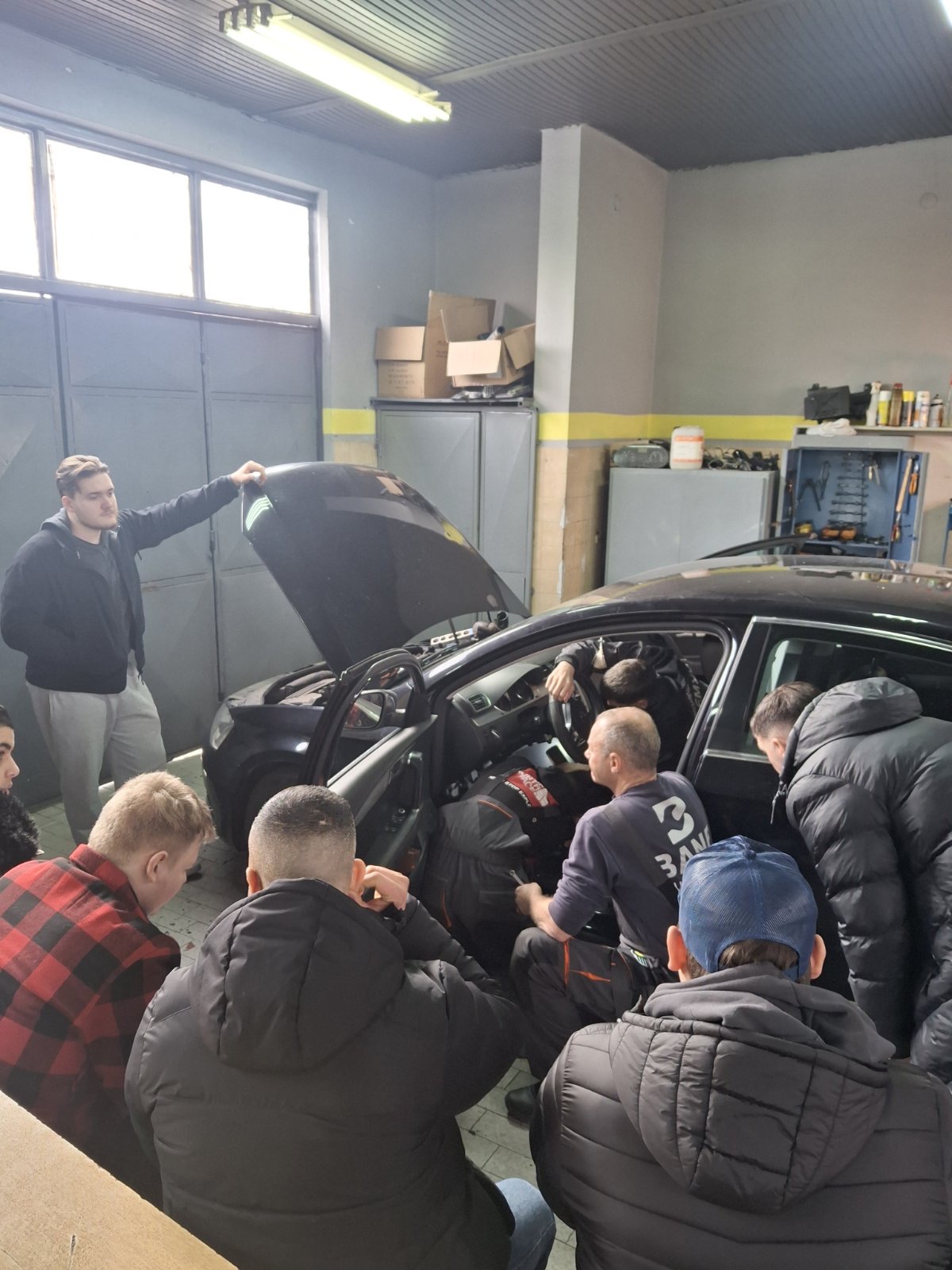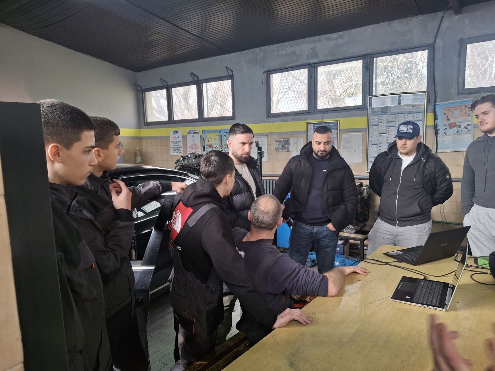 Заједно са нашим ученицима – аутомеханичарима, аутоелектричарима и машинским техничарима моторних возила – ученици из Шведске учествовали су у различитим радионицама. Радили су на поправци грејања у аутомобилима, зупчењу мотора, инспекцијском прегледу возила, као и на провери исправности електропокретача на пробном столу.