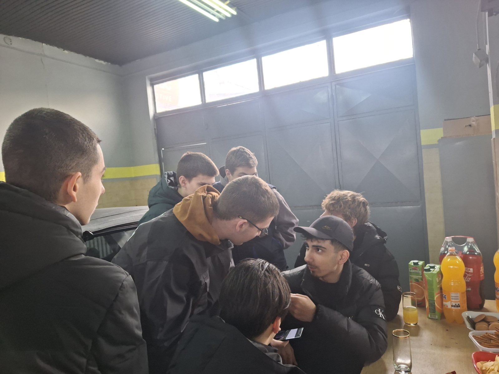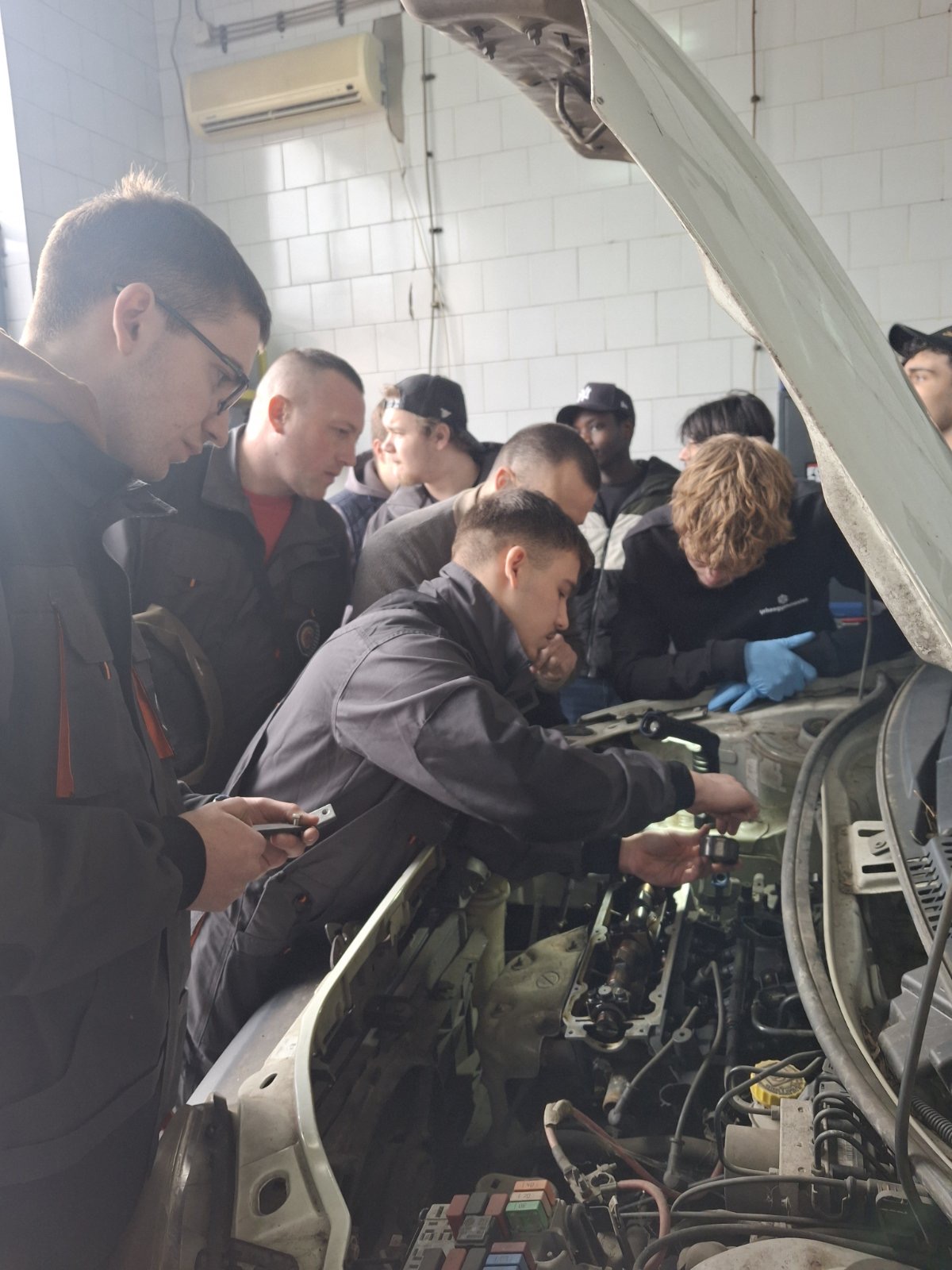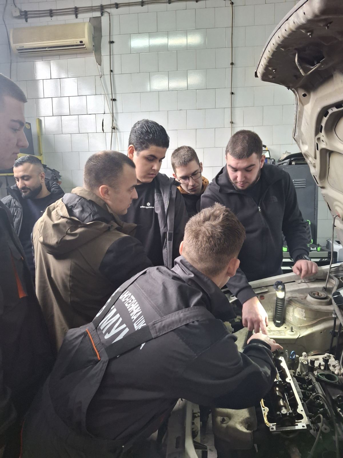 Заједно са нашим ученицима – аутомеханичарима, аутоелектричарима и машинским техничарима моторних возила – ученици из Шведске учествовали су у различитим радионицама. Радили су на поправци грејања у аутомобилима, зупчењу мотора, инспекцијском прегледу возила, као и на провери исправности електропокретача на пробном столу.